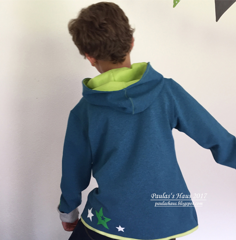 Endlich ist hier wieder einmal etwas anderes als Einkaufs-Netze und Frischhalte-Hüllen von der Maschine gehüpft. Sohnemann brauchte einen neuen Pulli und wünschte sich einen mit Rakete. Diese hat er übrigens selber gezeichnet. So entstand aus einem melierten Sommersweat dieser schöne Kuschelpulli. Und er wird seither täglich getragen. Ich bin total Fan von Sommersweat. Dieser ist etwas leichter als normaler Sweat und doch etwas fester als Jersey.